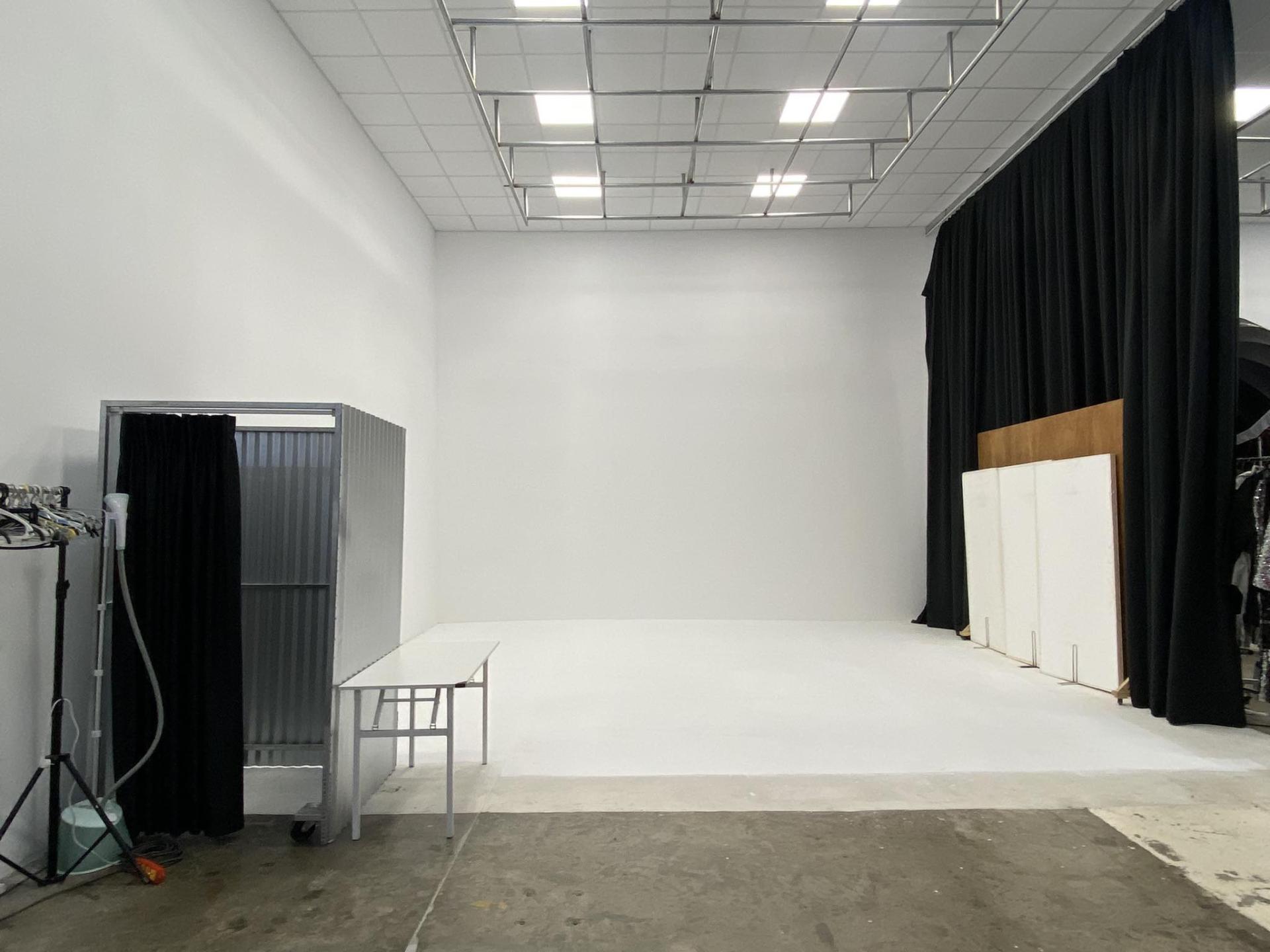 - Tường trắng vuông góc. DT: 7m x 12m. Có KV make up và phòng thay đồ riêng.
